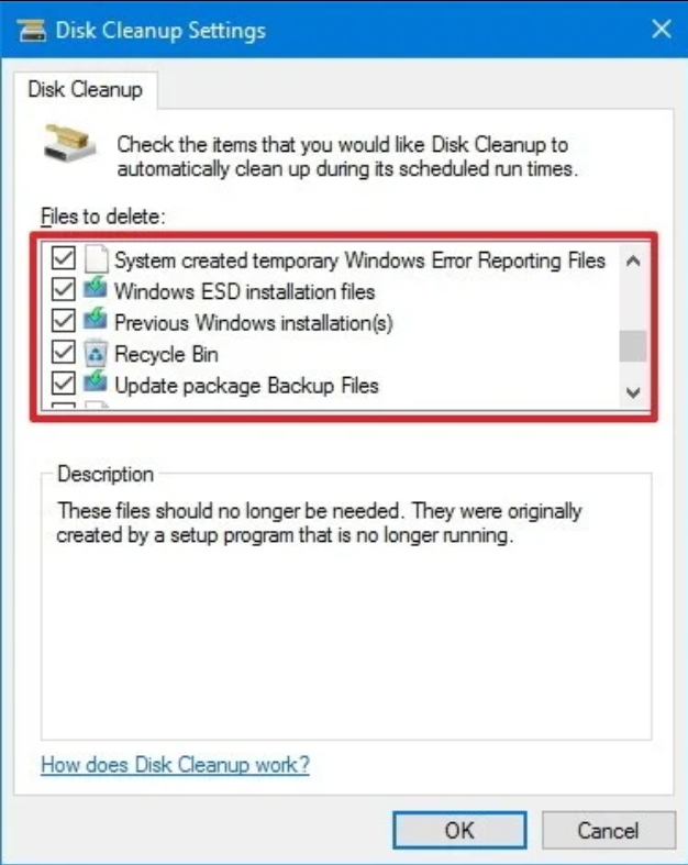 - بمجرد فتح إعدادات تنظيف القرص “Desk Cleanup” اختر الاتي حتى يتم تفريغ المساحة ثم اضغط Ok.