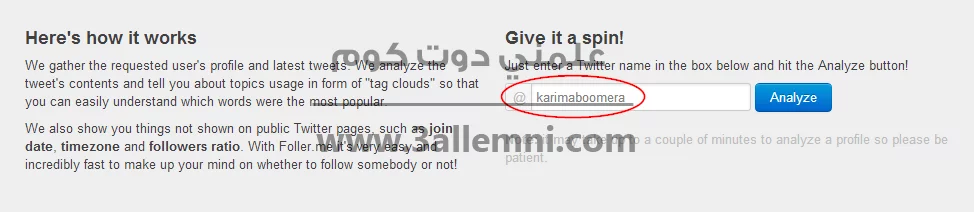 نستطيع من خلال موقع “Foller” معرقه معلومات عن اى على موقع التواصل الاجتماعى تويتر حيث بمجرد و ضع اسم الشخص على تويتر يقوم الموقع ببدأ البحث و يوفر لك معلومات عن اسم الشخص المسجل به و تاريخ الذى سجل به فى تويتر و موقعه الجغرافى و عدد التغريدات التى كتبت و عدد المتابعين و الذين هو يتابعهم  و يوفر لك معلومه اذا كان حساب الشخص محمى ام لا فاذا كان محمى فستجد كلمه “Protected” بجوار الاسم .
