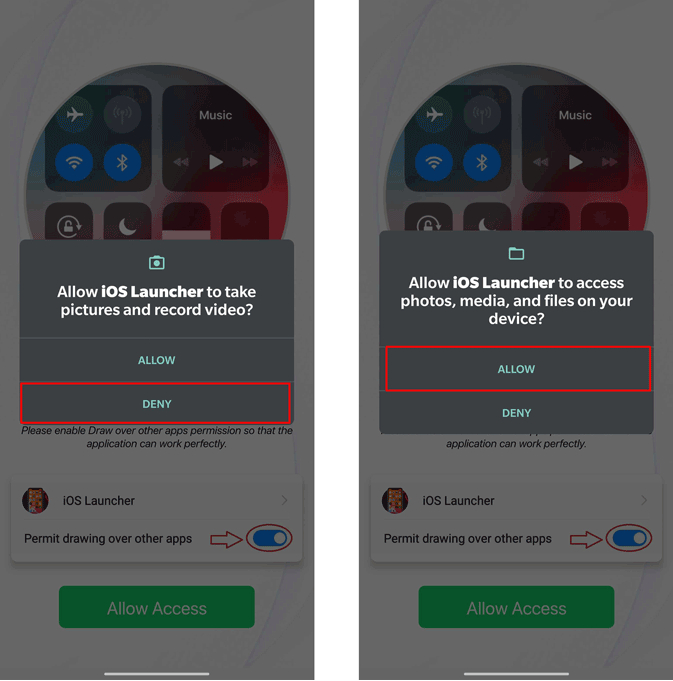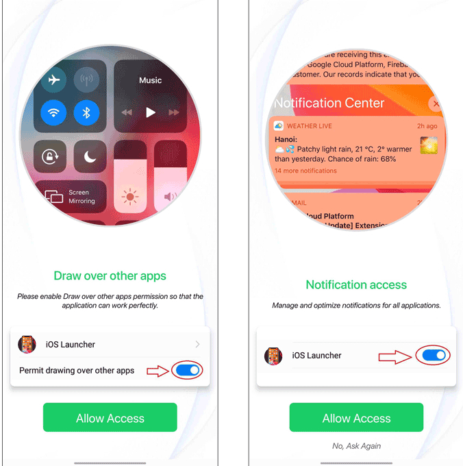 - اذا كنت ترغب في محاكاة دقيقه للايفون قم بالسماح بتمكين التبديل في الصفحة التالية لمنح الإذن للتطبيق بالعرض فوق التطبيقات الأخرى والوصول إلى الإشعارات مما يسهل الوصول للوحة التحكم اثناء استخدام التطبيقات الاخرى و كذلك ظهور الاشعارات بشكلها الجديد في iOS 14 .
