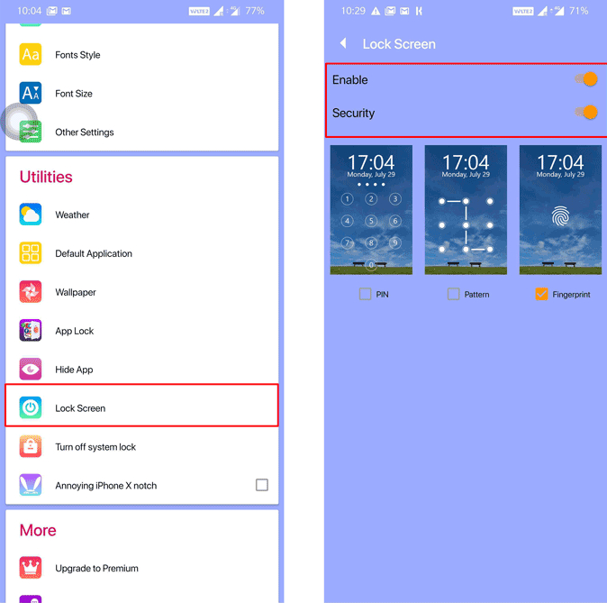 - قم بتمكين شاشة القفل “Lock Screen” في اسفل القائمة و اختر اي من انواع القفل التي تفضلها سواء الرمز او النمطي او البصمة .