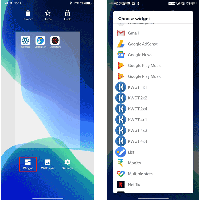 - اضغط لفترة طويلة على الشاشة الرئيسية و قم باختيار الأدوات “widgets ” و في اسفل القائمة اختر KWGT 4 * 2