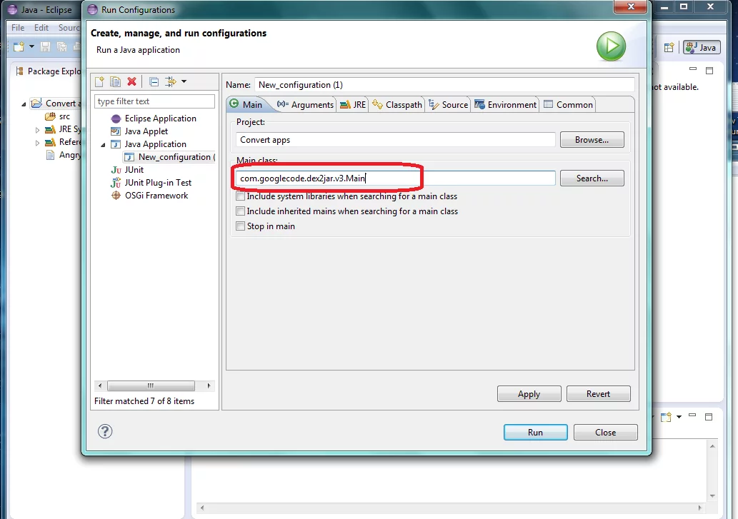 8- اكتب في ال main class >> ” com.googlecode.dex2jar.v3.Main “