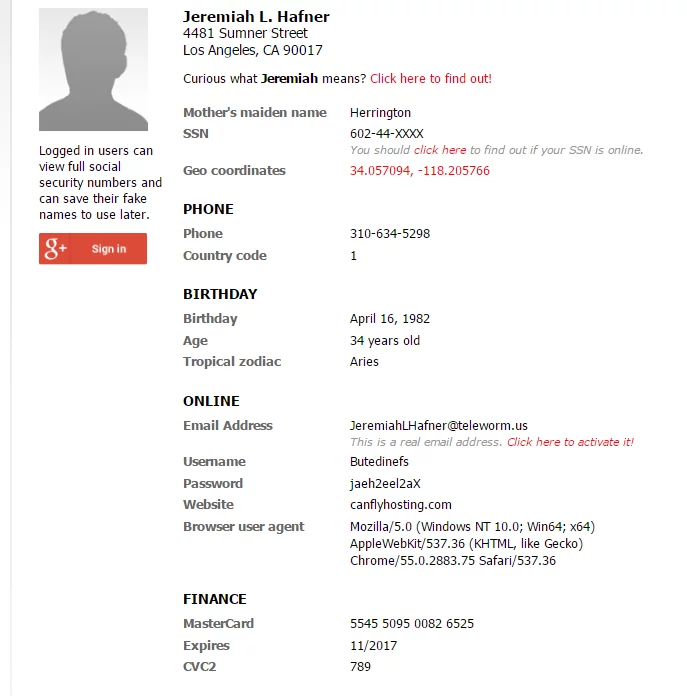 - ستجد كما هو موضح بالصوره التاليه انه تم اظهار لك عنوان و اسم و رقم هاتفي و رمز بريدي و رقم فيزا وهميين مجاناً تستطيع استخدامهم في التسجيل في اي خدمة تريدها تتطلب الحصول علي تلك المعلومات.