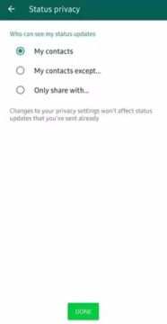 - جهات الإتصال باستثناء My contacts except: هذا الخيار سوف يتيح لك استثناء بعض الأشخاص من رؤية حالة واتساب الخاصة بك.