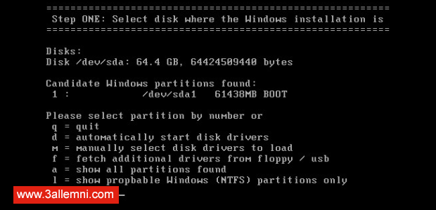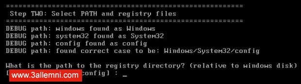 - استمر فى الضغط على “Enter” حتى تحصل على تلك الشاشه التاليه ايضا و هى الخطوه التى بعد الخطوه السابقه مباشره حيث ان الخطوه السابقه كان يسألك على المكان الخاص بالـ Reigstry و هو يحصل عليه بشكل تلقائى و بعد ذلك سوف تقوم باختيار “1” لكى تقوم بحذف الباسورد و هو الاختيار “Password reset“