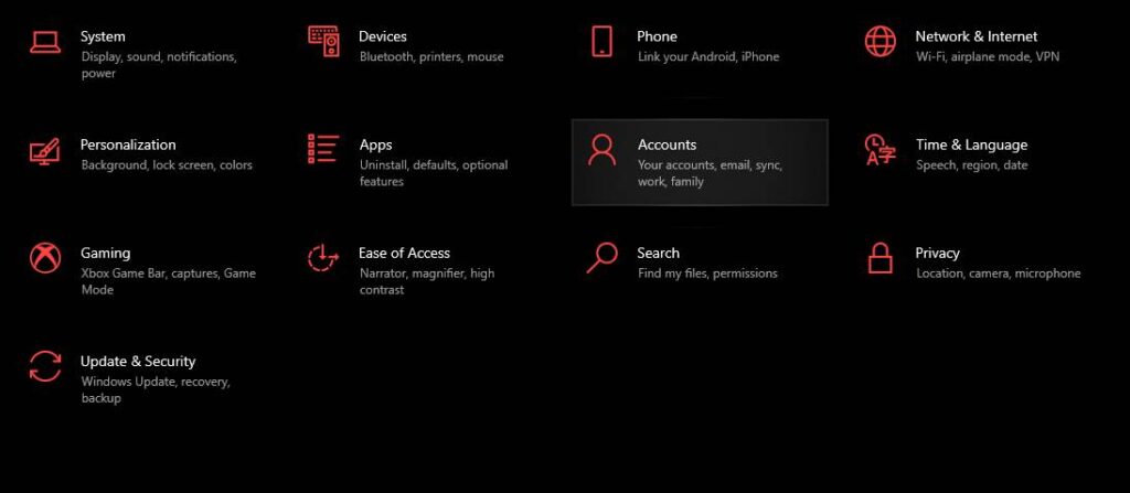 - قم بالضغط على الحسابات “accounts” و تحتوي على حسابات على ويندوز و كذلك حسابات العائله و المزامنه و البريد الالكتروني .