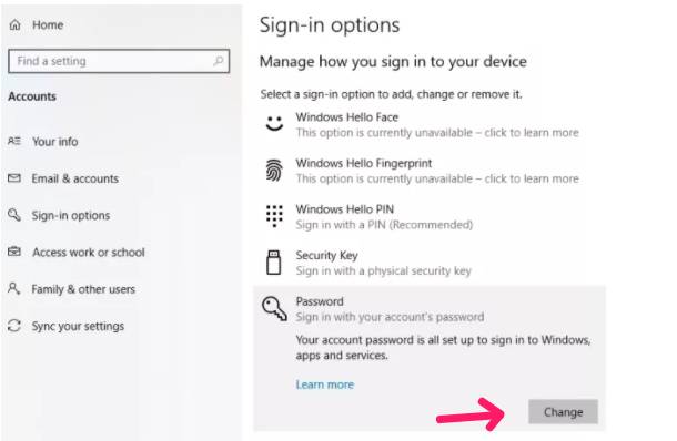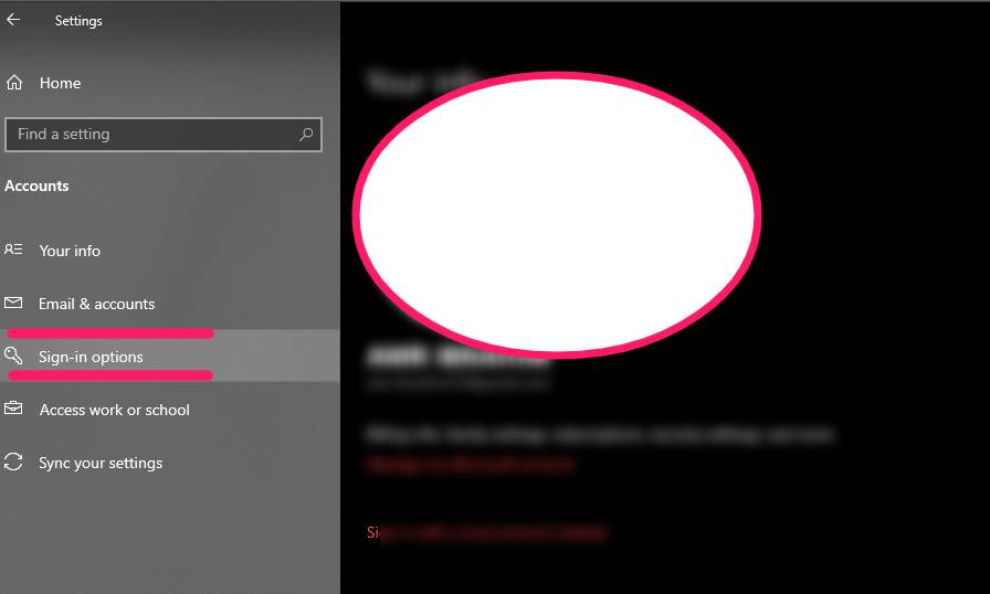 - سيتم توجيهك الى قائمة تحتوي على العديد من الخيارات مثل مزامنة الاعدادات “sync your settings” و كذلك معلومات عن الحساب المستخدم حاليا على ويندوز “your info” و امكانية اضافة حساب اخر للويندوز او بريد الكتروني اخر “Email & accounts” و خيارات الدخول للويندوز “sign in options ” و هي ما سوف تقوم بالضغط عليها من اجل تغيير باسورد windows 10 .