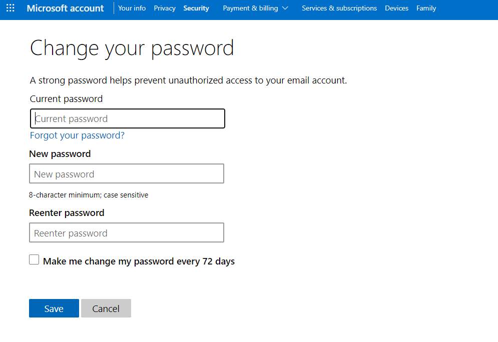 اذا كنت تمتلك حساب ويندوز 10 مرتبط بحسابك على مايكروسوفت فيمكنك بسهولة اعادة تعيين الباسورد من خلال الدخول على رابط حسابك على مايكروسوفت من هنا و قم باختيار Forgotten my current password.
