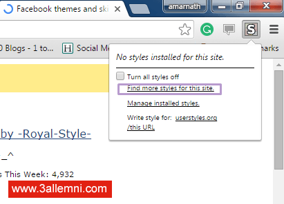 - الان قم بزياره موقع “الفيسبوك” ثم اضغط على الاداه و التى سوف تجد الايفونه الخاصه بها على شكل حرف S و اختار منها “Find more styles for this site” لكى تتمكن من وجود اشكال و الوان لموقع الفيسبوك