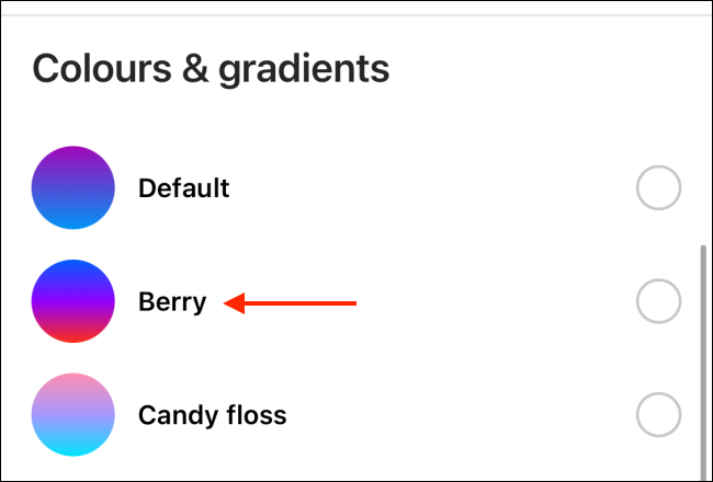 • بدلًا من ذلك يمكنك الانتقال إلى قسم Colors & Gradients، ومن خلال هذا القسم يمكنك اختيار لون المحادثة الذي تريده.