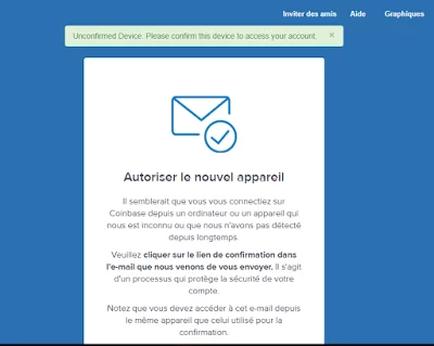 - ثم سوف يقوم موقع محفظة الcoin base بارسال اليك رسالة علي بريدك الالكتروني الذي قمت بكتابة في تسجيل الحساب لكي يتحقق منها للدخول علي محفظة الcoin base وليتحقق من الجهاز الذي دخلت منه .