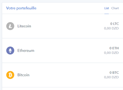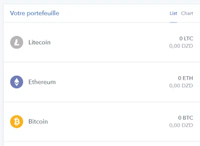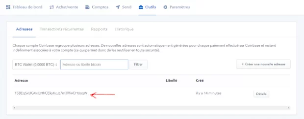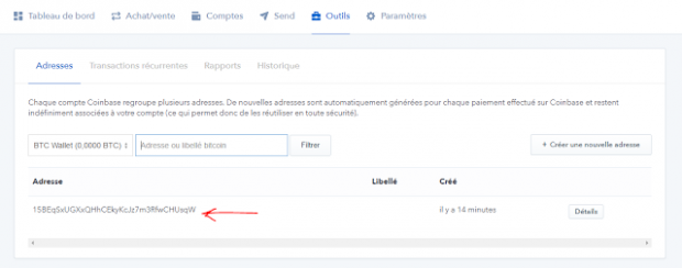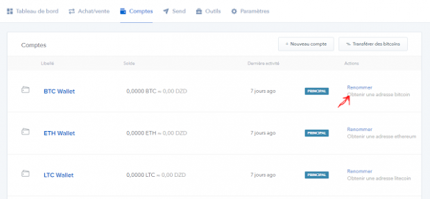 - قم بالتوجه الي الاعدادات الخاصة بمحفظة الcoin base قم بالتوجه الي Account او compte , ثم قم باختيار العملة التي تريدها وانقر علي انشاء عنوان جديد .