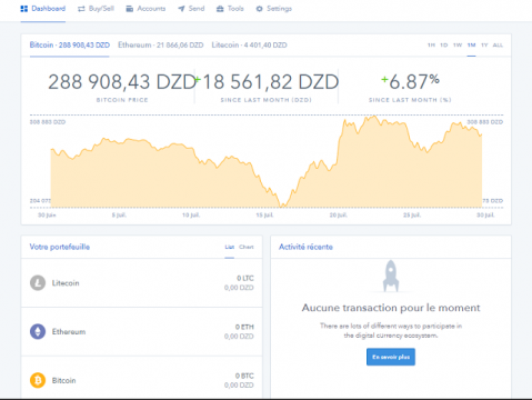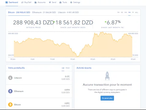 - وسوف يتم توجيهك الي تحكم لوحدة محفظة الcoin base ,حيث انه توفر لك سعر البيتكوين , بتمن العملية المحلية , تغيرات الساعة في اخر ساعة و يوم و اسبوع و شهر و هكذا