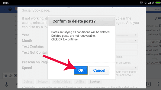 ثم سوف تقوم بتشغيل الإضافة لكي يتم حذف كافة المنشورات من الحساب الخاص بك على الفيسبوك كما موضح لك في الصورة التالية.