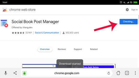 إن طريقة حذف جميع منشورات الفيس بوك دفعة واحدة من الهاتف لا تحتاج إلى استخدام الحاسوب حتى وإن كنت سوف تقوم باستعمال الإضافات ومتصفح الويب لجهاز الحاسوب، ففي بداية الأمر بعد أن يتم تحميلك لمتصفح ياندكس من جوجل بلاي عليك الذهاب إلى متجر الإضافات لجوجل كروم لكي يتم تحميل إضافة Social Book Post Manager وهي الإضافة التي تقوم باستعمالها لحذف منشورات فيسبوك مرة واحدة، ولذلك عليك القيام بالبحث عن الإضافة عن طريق اسمها الموجود في المتجر أو يمكنك الانتقال إلى رابط الأداة ثم قم بالضغط على إضافة الأداة ومن ثم الانتظار لكي يتم التثبيت كما موضح لك في هذه الصورة.