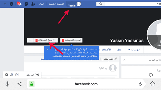 والآن سوف تدخل إلى سجل النشاطات الخاص بحسابك في الفيسبوك لكي تبدأ في مسح كافة المنشورات عن طريق الهاتف الخاص بك، ويتم ذلك عن طريق ذهابك إلى الصفحة الشخصية ومن ثم الضغط على اختيار سجل النشاطات، وبعدها قم باختيار المنشورات لكي يتم فلترة نشاطاتك الخاصة على فيسبوك كما في هذه الصورة الآتية.
