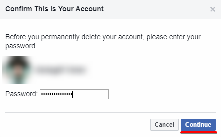 • في الصفحه التالية عليك بكتابة الباسورد حتى يتم حذف حساب فيسبوك نهائيا و بعد كتابة الباسورد قم بالضغط على متابعة “Continue”.