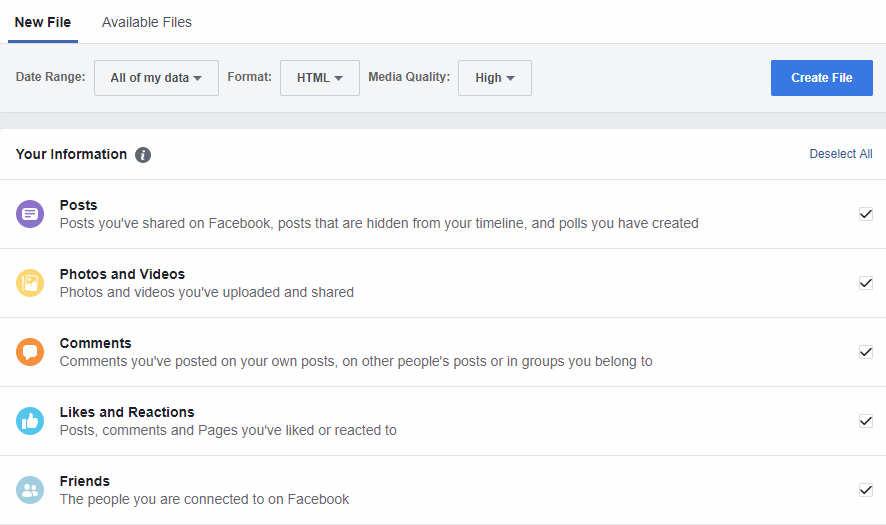 يحتوي حساب فيسبوك الخاص بك على كافة البيانات التي تتفاعل من خلالها مع الاخرين مثل المنشورات “Posts”  و كذلك التعليقات و الاعجابات و الاشخاص الذي تتابعهم و كذلك الدعوات “Events” و المجموعات التي انضممت اليها و العنوان الخاص بك الذي قمت بتسجيله و رقم الهاتف الذي قمت بتسجيله ايضا و الرسائل و قائمة الاصدقاء و العديد من الامور الاخرى التي قمت بها على حساب فيسبوك .