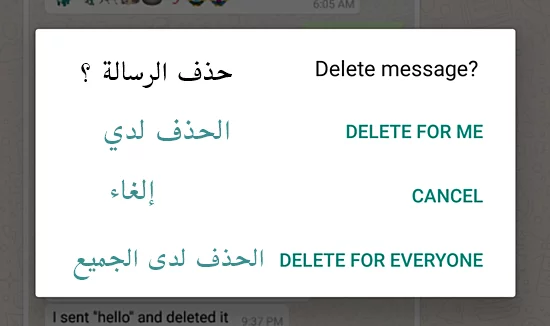 الحذف لدي الجميع ” Delete for everone ” : هي لحذف الرسالة من عندك وعند المرسل اليه