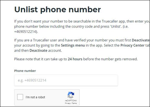 • قم إدخال رقم هاتفك ثم قم بتفعيل التحقق من أنك لست رجلاً آلياً ثم قم بالضغط على Unlist Phone Number لتزيل الرقم من قاعدة البيانات.