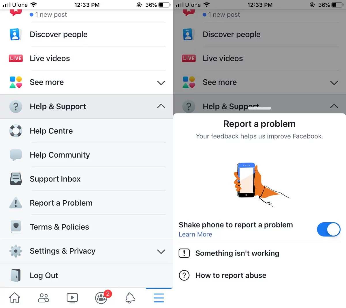 وبالنسبة للطريقة الثانية سوف تطلب منك الدخول لقائمة إعدادات الفيس بوك ومن ثم التوجه إلى HELP AND SUPPORT وبعدها النقر على REPORT A PROBLEM ثم القيام باستخدام المؤشر الذي سوف يظهر لكي يتم إلغاء خاصية الاهتزاز للإبلاغ عن الأعطال الموجودة في التطبيق.
