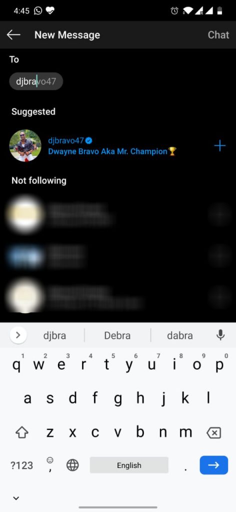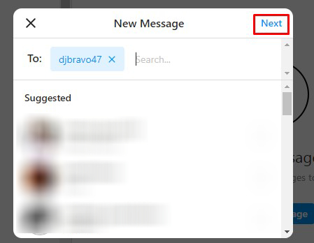 • ستظهر نافذة منبثقة مع الاقتراحات إذا كان الشخص مدرجًا في قائمة الاقتراحات فانقر على اسمه  و ابدا المراسله اذا لم يكن موجودا يمكنك البحث عنهم في خانة البحث باستخدام المعرف الخاص بهم الذي يبدا بــ @ .