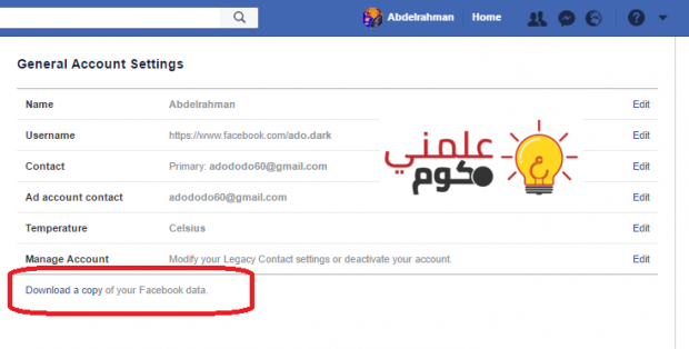 - من خلال خيار الخيارات العامة للحساب أو General Account Settings قم بالضغط علي ” تنزيل نسخة من بياناتك ” أو ” Download a copy of your Facebook data ” .