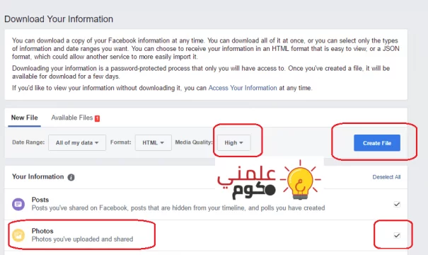 خطوات تنزيل ملفاتك و الصور الخاصة بك من موقع فيس بوك :