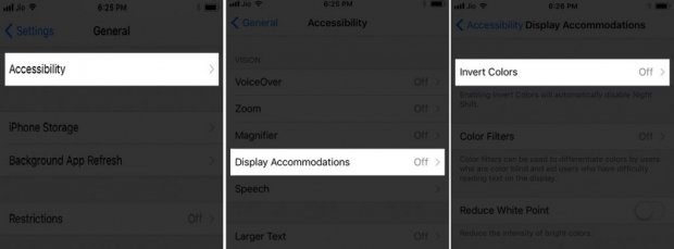 - بعد ذلك قم بالضغط على “Display Accommodations” ومن ثم تفعيل الخاصيه عن طريق تفعيل “Smart Invert” من الاعدادات المتواجده امامك .