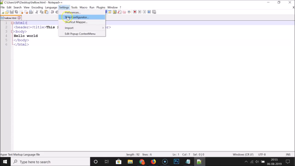 - بعد تحميل وتشغيل برنامج Notepad++ على جهازك قم بالضغط على Settings في شريط القوائم العلوي.