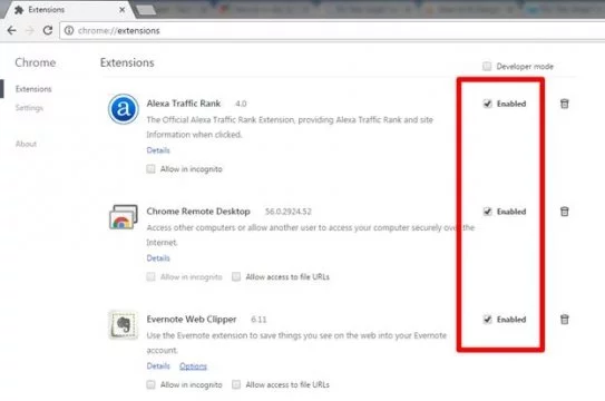 في هذه الصوره هي الصفحة التي سوف تراها عند فتح chrome://extensions. في المستطيل الأحمر، يمكنك ان ترى خيارات تمكين. يمكنك إلغاء منهم لتعطيل.