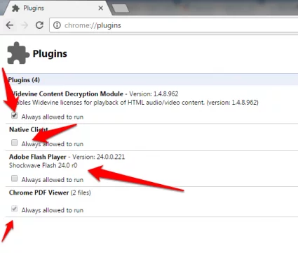 في هذه الصوره هي الصفحة التي سوف تراها عند فتح chrome://plugins. يمكنك تمكين وتعطيل اي منها فقط عن طريق فحص وإلغاء الصناديق.