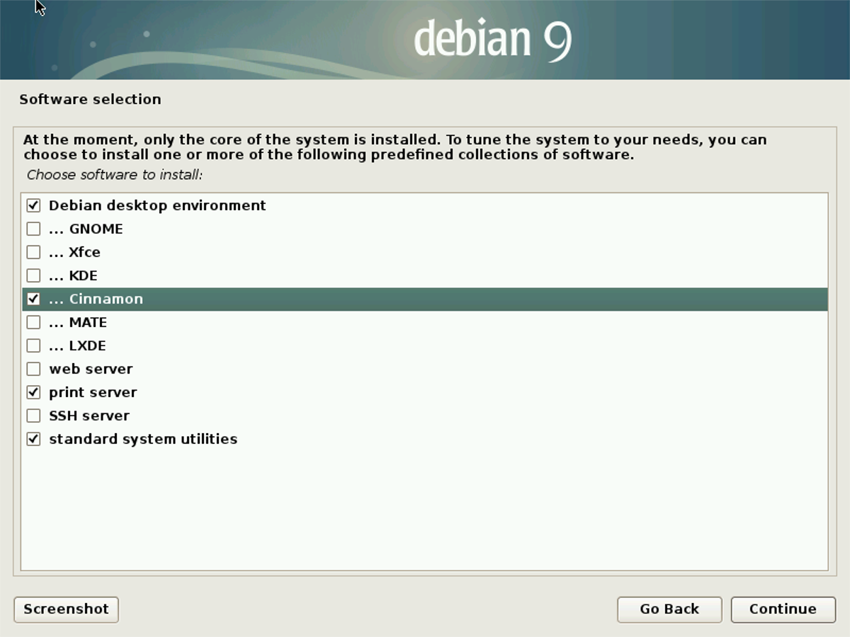 بعد الإنتهاء من إختيارك لأوضاع سطح المكتب يُمكنك الضغط على continue لتثبيت حزمة النظام، ولكن عليك الإنتباه لهذه العملية فسوف تستغرق وقتاً طويلاً.