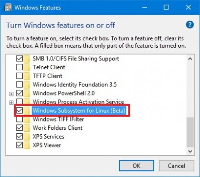 الا يوجد فى القائمه الخاصه بتلك الخواص سوف تقوم بوضع علامه على “Windows Subsystem for Linux Beta“