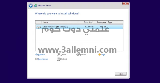 بعد ذلك تقوم بأختيار البارتيشن الذى تود ان تقوم بتنزيل ويندوز 10 عليه و الضغط على Next