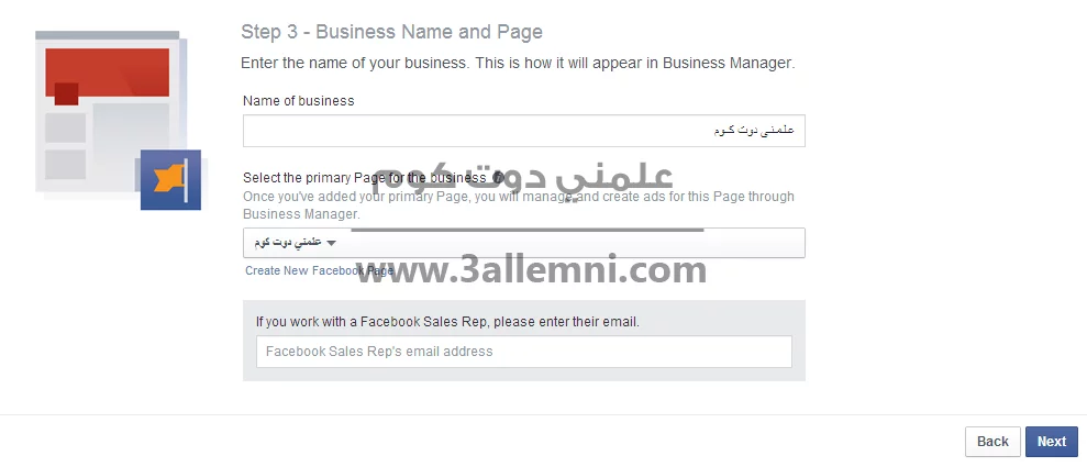 بعد ذلك تقوم بوضع اسم الصفحه و اختيار الصفحه المراد وضع الحساب البيزنس بها .