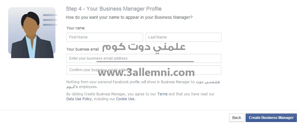 بعد ذلك تقوم بكتابه الاسم الاول و الاسم الاخير و ايميل الادمن مرتين ثم الضغط على Creat Business Manager و سوف تجد انه تم اضافه ذلك الحساب ولا احد يتمكن من مسحه .