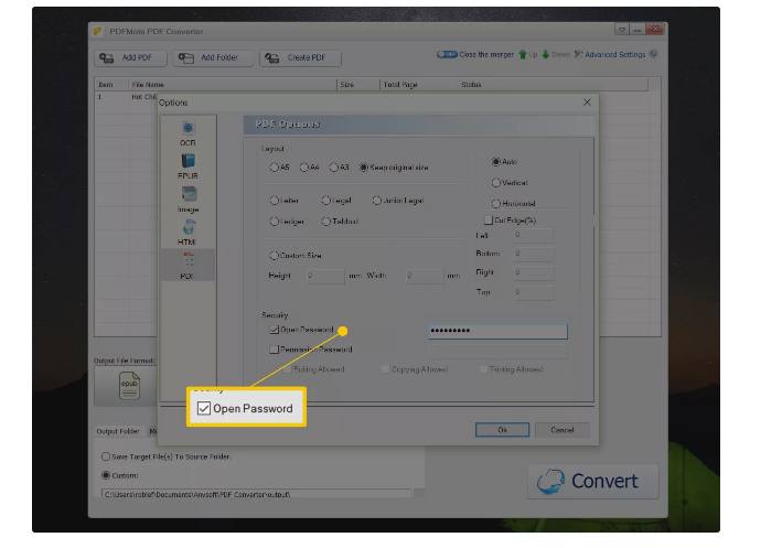 - في يسار شاشة البرنامج اختر علامة التبويب PDF في اخر القائمة ثم قم بالضغط على المربع الخاص بـ open password و قم بكتابة الباسورد من اجل حماية ملفات Pdf بكلمات مرور ثم قم بالضغط على ok .