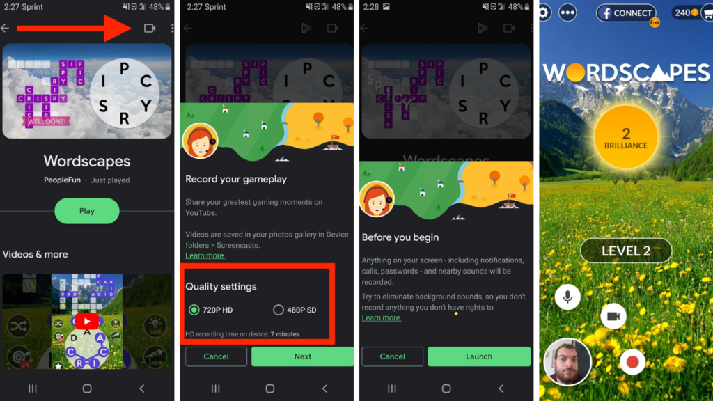 يحتوي جوجل بلاي على ميزة تسجيل مدمجه للالعاب و هي ميزه مجانيه يمكنك استخدامها بجودة 480 بيكسل و حتى 720 بيكسل فقط و كذلك يمكنك اضافة لقطات كاميرا من العدسة الأمامية لهاتفك و للتمكن من ذلك قم بفتح التطبيق و حدد اللعبة و اضغط على زر التسجيل أعلى صفحة تفاصيل اللعبة ، ومن هنا يمكنك تحديد جودة الفيديو .