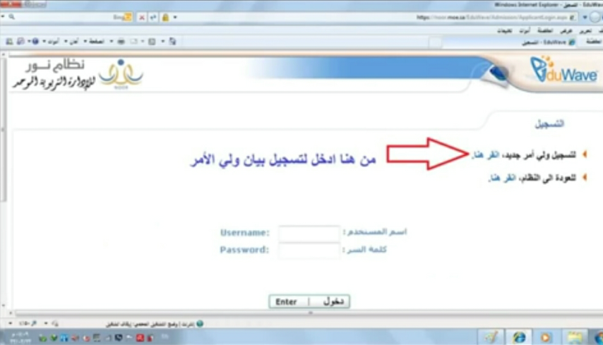 أما في حالة كان ولي الأمر في سلك التعليم فيمكنه الحصول على اسم المستخدم وكلمة المرور من مدير مدرسته، وإدخال هذه البيانات أمام خانة اسم المستخدم وخانة كلمة المرور.