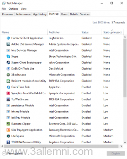 3) بعد ذلك سوف تبحث عن البرامج التى امامها “Medium” او “High” فى عمود “Start-Up Impact” فاذا كان تلك البرامج لا تفيدك بشئ فسوف تقوم بتعطيلها عن الطريق الضغط عليها ثم بعد ذلك الضغط على زر “Disable” المتواجد فى اسفل يمين الـ “Task Manager” - الخطوه الثالثه : تفعيل خاصيه البدأ السريع و هى خاصيه قامت مايكروسوفت بتفعيلها حيث انها لا تغلق الكمبيوتر بالكامل و لكنها تضغه فى وضع السبات “Hibernate” و للتوضيح اكثر من ذلك “ضع السبات يتم كتابة جميع المعلومات مثل البرامج والمواقع التي يعمل عليها المستخدم إلى القرص الصلب ومن ثم يتم إيقاف تشغيل الجهاز لتوفير الطاقة بشكل كبير”