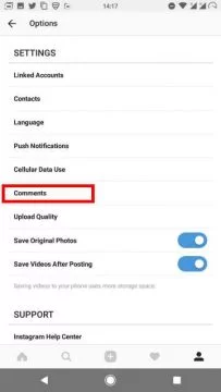 و يمكنك الإنتقال الي خيارات تصفية التعليقات عن طريق فتح ملفك الشخصي و أضغط علي زر الثلاثة نقاط و منها إعدادت إنستجرام و أضغط علي خيار التعليقات و قم بتحديد النوع الأنسب لك .