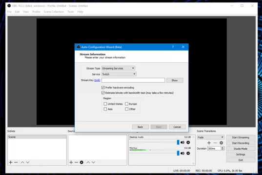 عند فتح التطبيق سوف تجد خيارات الضبط التلقائية , و سوف يطلب منك ال ID الخاص بالبث و الذي تقوم بأحضارة من ملفك الشخصي في حساب Twitch و سوف تجده في الأعدادت تحت عنوان Stream Key .