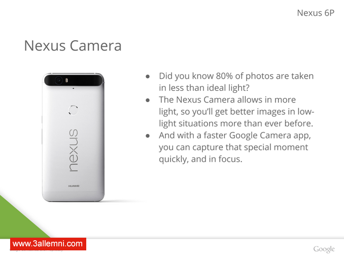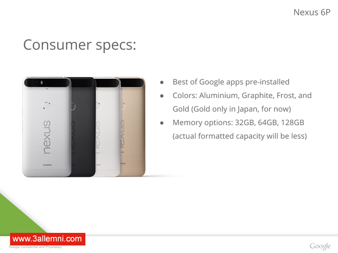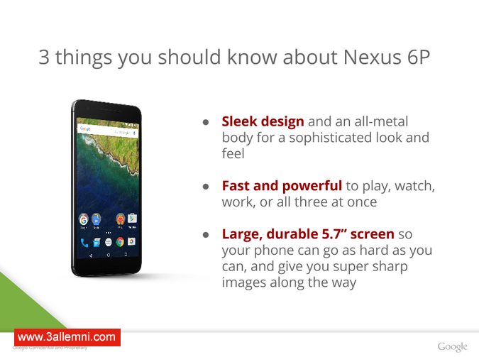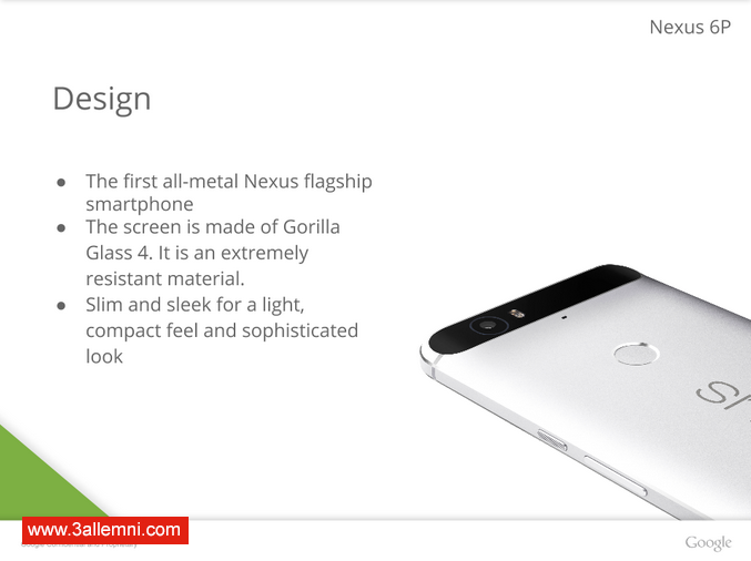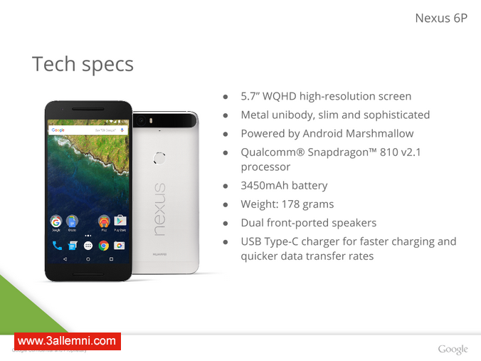هاتف Nexus 6P سيكون أول هاتف جوجل نيكسس من شركة واوى ,و يبدو ان الشركة تعمل على تقديم الهاتف بصورة جيدة ,و قد تمّ تسريب العديد من الصور من هذا التقديم و هذا قبل الإعلان عن الهاتف بيومين ,بفضل تلك الصور تمّ تأكيد مواصفات الهاتف.