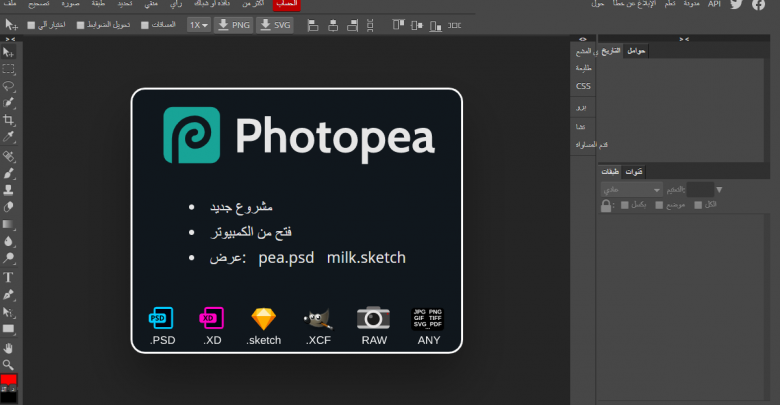 - يدعم برنامج Photopea الكثير من التنسيقات الخاصة بالملفات مثل JPG و PSDو PNG و XDو Sketchو SVG، وذلك يجعل البرنامج سهل في الاستخدام بالإضافة إلى أنه متعدد المنصات.