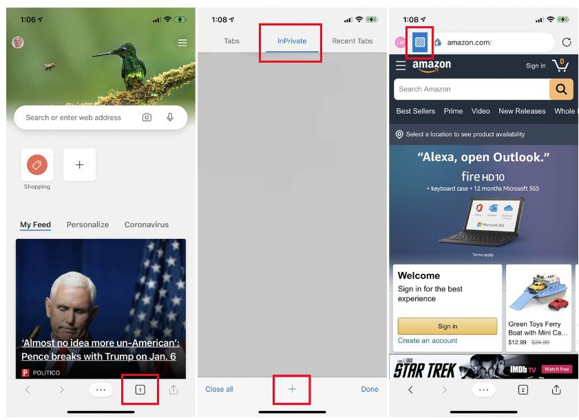 و في حال اذا كنت تستخدم التطبيق الخاص بمتصفح Edge و ترغب في منع التتبع أثناء تصفح المواقع من خلال استخدام الوضع الخفي فقم بالضغط على علامة فتح تبويب جديدة في الشريط السفلي و سيتم توجيهك لنافذة جديدة و في الشريط العلوي قم بتحديد خيار inPrivate و يوضح Edge إلى أنه يتم عرض الصفحة في وضع InPrivate من خلال أيقونة زرقاء على الحافة اليسرى من شريط العناوين .