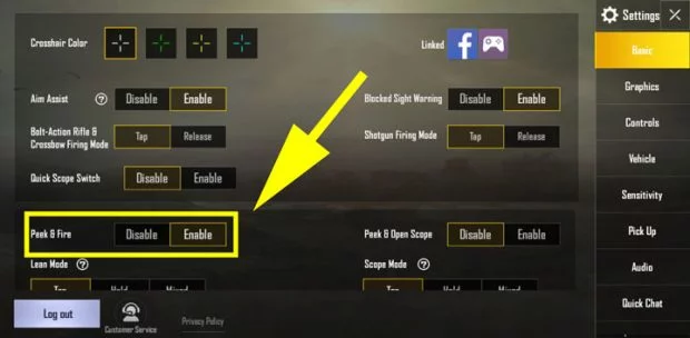 الطريقة الأولى: و هي عن طريق تفعيل خاصية Peek & Fire من إعدادات اللعبة ، هذه الخاصية قد تساعدك إلى حد ما على التقليل من إرتداد الأسلحة ، و بالرغم من أنها لا تقوم بإلغائه تمامًا إلا أنه قد تفيدك أثناء اللعب.