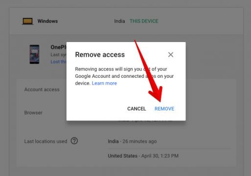 ستظهر لك نافذة منبثة داخل المتصفح للتأكد بالفعل من أنك تُريد حذف هذا الهاتف من الحساب مزامنة، قم بالضغط على REMOVE لإنهاء العملية.