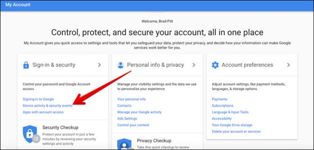 في الصفحة الخاصة ب الحساب الخاص بك أو My Account، ستحتاج إلى الضغط على خيار Device activity & security events، في المربع الخاص ب Sign-in & security.