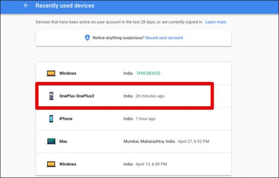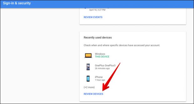 أسفل المربع الخاص بال Recently used devices ستجد الأجهزه التي تم مزامنة البيانات عليها من خلال حساب جوجل الخاص بك، قم بالضغط على REVIEW DEVICES في الأسفل.